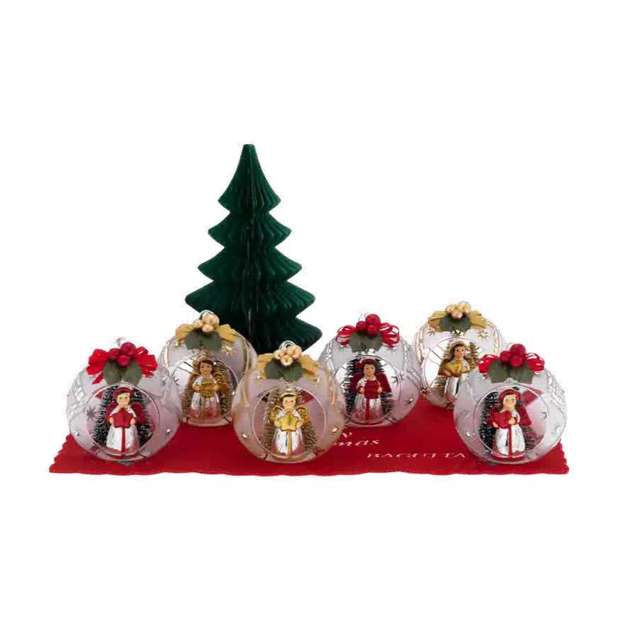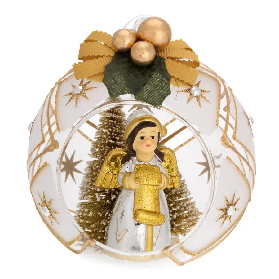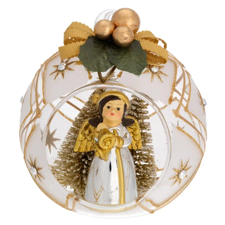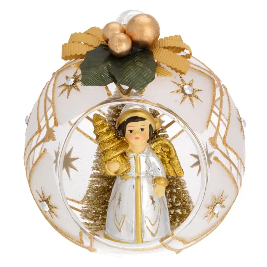 Gli alberelli dorati simboleggiano la crescita e la speranza, mentre l’angelo aggiunge un tocco di serenità e benedizione. Il fiocco, simbolo di dolcezza, completa la decorazione con il suo design elegante e raffinato. L’oro brillante della sfera riflette la luce, creando un’atmosfera scintillante che cattura l’attenzione e dona un aspetto lussuoso alla tua decorazione natalizia.