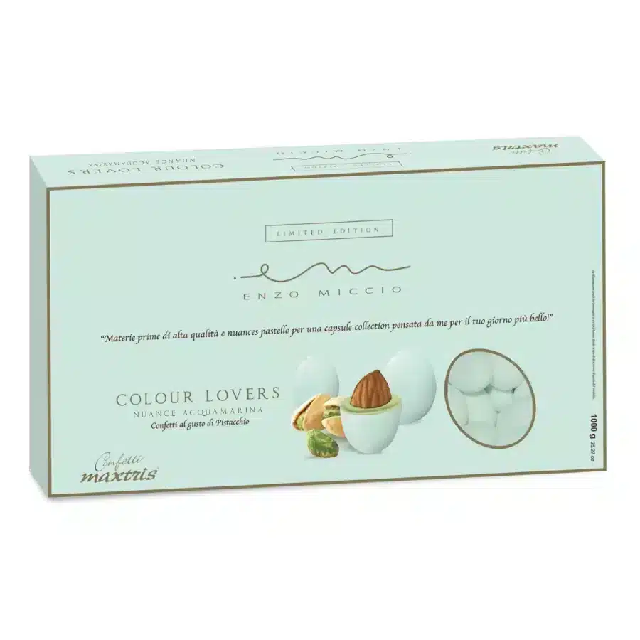 L’Enzo Miccio Nuance Acqua Marina è costituito da una mandorla tostata ricoperta da cioccolato bianco al gusto di Pistacchio e da un sottilissimo strato di zucchero.